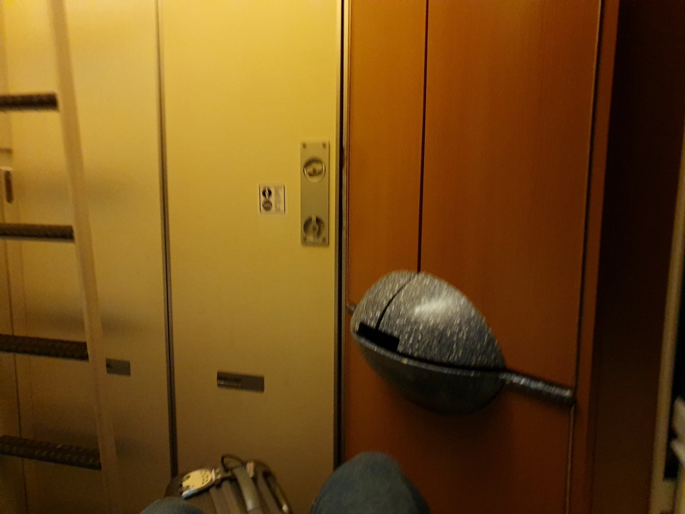 사진이 흔들렸지만 야간열차 내부는 이렇게 생겼습니다. 더 이상의 공간은 없어요. 오른쪽 문을 열면 자그마한 세면대와 조명이 있어요. 간단한 세수나 손 씻기 정도는 가능했습니다.