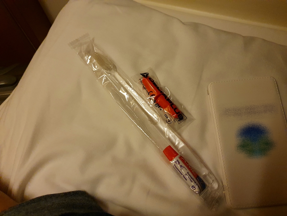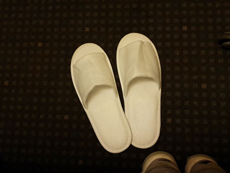 간단한 세면도구(칫솔, 치약, 수건 2장)와 일회용 슬리퍼, 그리고 생수 2병을 제공해주네요.